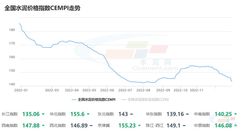 截止到,12月底,全國(guó)水泥價(jià)格指數(shù)CEMPI較去年同期下滑41.77。回顧2022年,“旺季不旺,淡季更淡”是全國(guó)水泥行情的基本旋律。