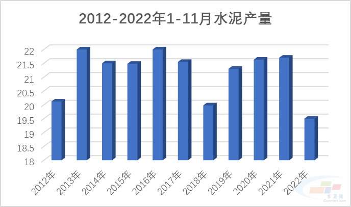 12月15日,國(guó)家統(tǒng)計(jì)局發(fā)布11月份經(jīng)濟(jì)數(shù)據(jù)。其中,2022年11月份,水泥產(chǎn)量1.92億噸,同比下降4.7%;1-11月份,水泥產(chǎn)量19.5億噸,同比下降10.8%。