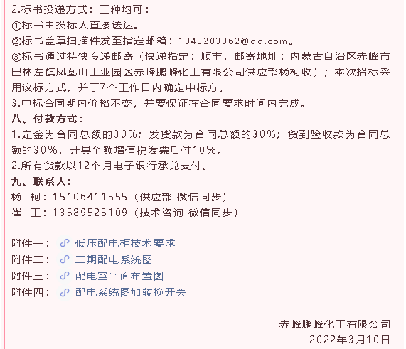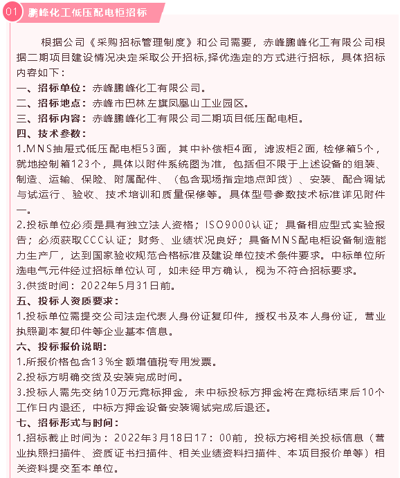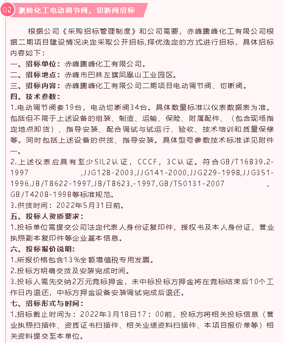 【招標(biāo)公告】鵬峰化工低壓配電柜、電動(dòng)調(diào)節(jié)閥、切斷閥招標(biāo)